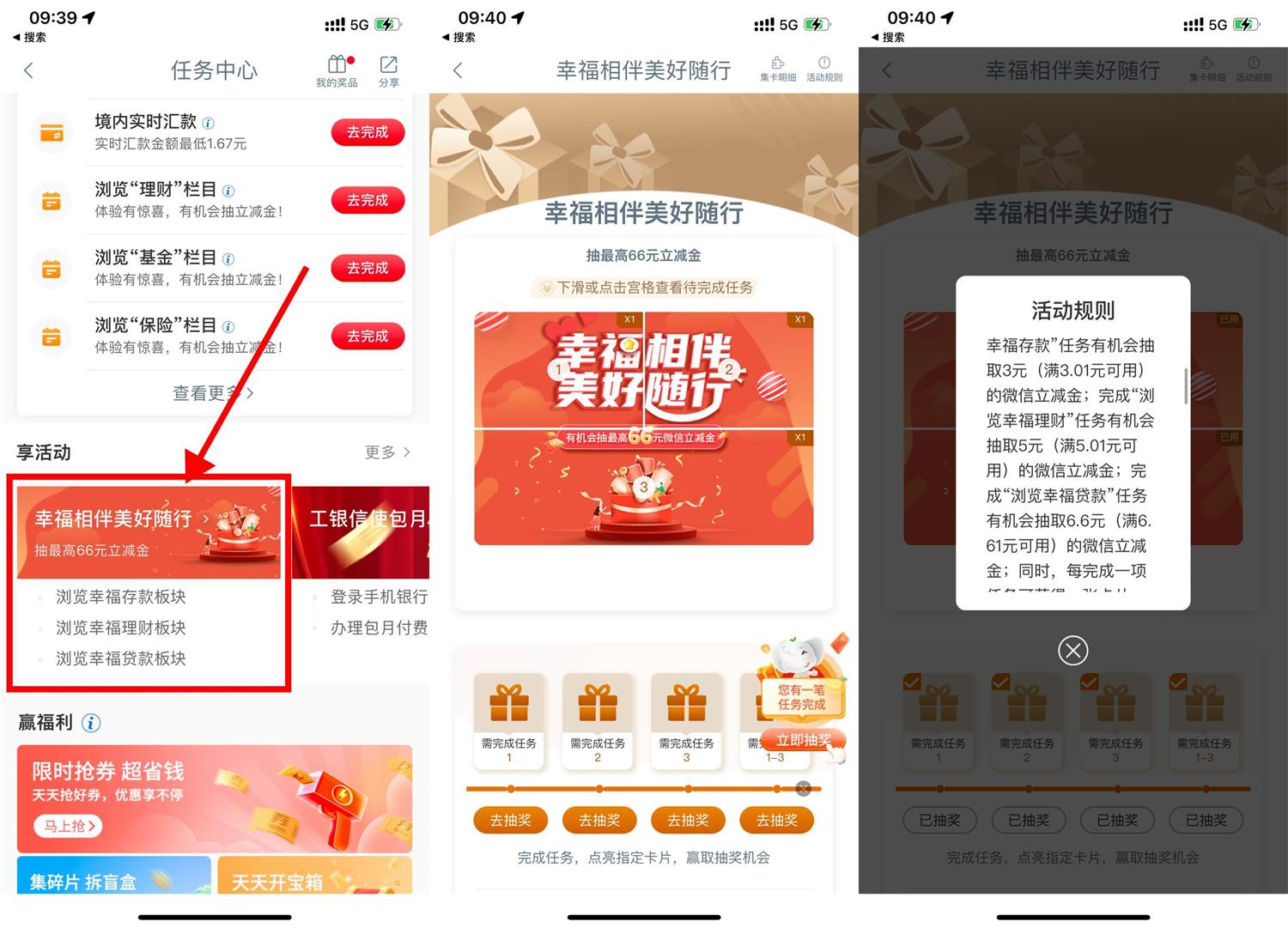 工行APP搜索“任务中心”->幸福相伴 美好随行->简单浏览得4次机会抽3~66元微信立减金